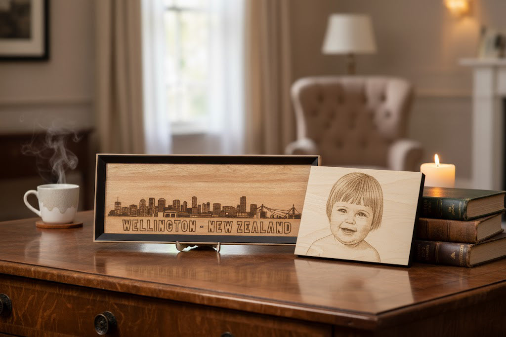 Add a timeless touch to your creations with custom wood engraving from The Photo Hub. Using precise laser technology, we etch names, logos, or designs directly into the wood surface for a beautifully detailed, tactile result.